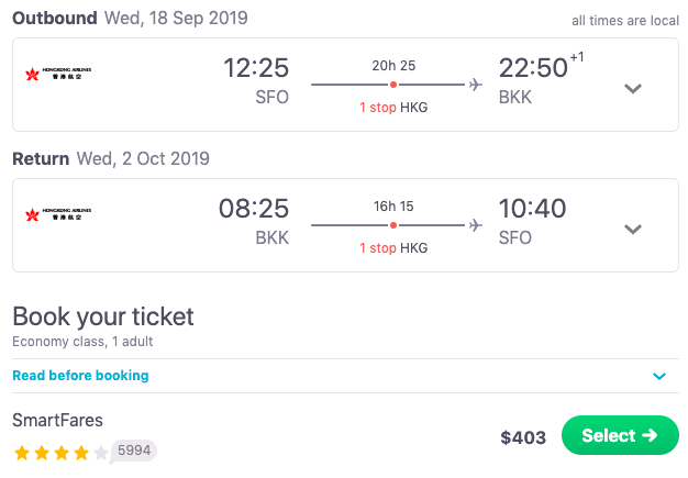 San Francisco (SFO) to Bangkok (BKK) for $403 round-trip on Hong Kong Airlines via SmartFares: