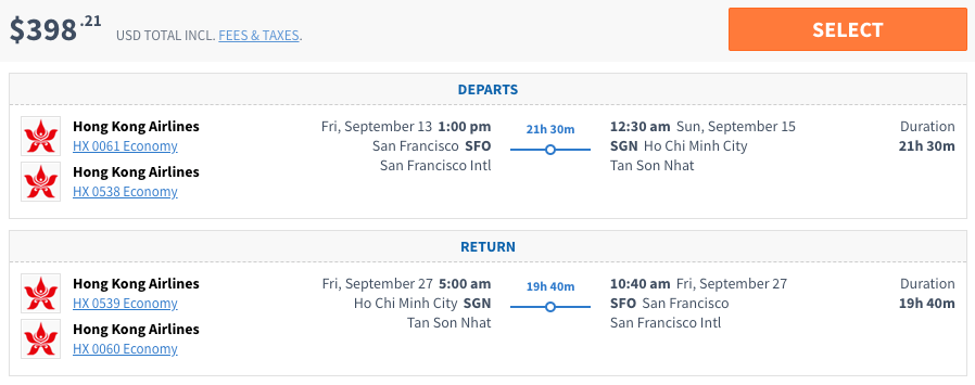 San Francisco (SFO) to Ho Chi Minh City (SGN) for $398 round-trip on Hong Kong Airlines via SmartFares: