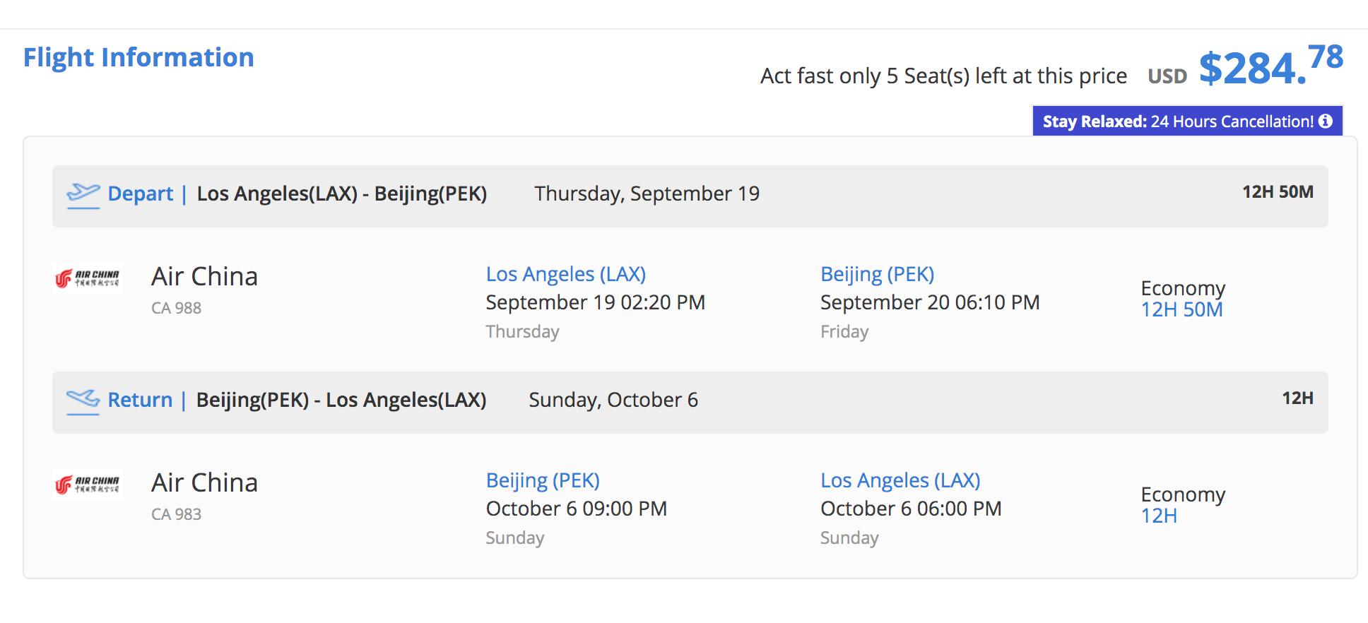 Los Angeles (LAX) to Beijing (PEK) for $285 round-trip nonstop on Air China: