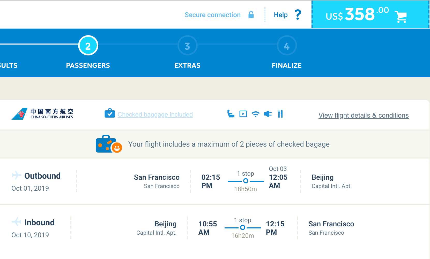 San Francisco (SFO) to Beijing (PEK) for $358 round-trip on China Southern:
