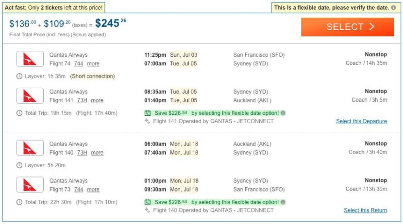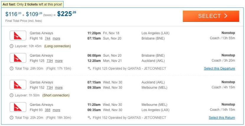 This deal is exclusively available through Cheapoair.com, so while it's tempting to head straight over to Google Flights, you won't find anything there. Note that $225 round-trip is in "mistake fare" territory, so you may want to avoid making nonrefundable hotel bookings until we hear from Qantas about whether or not these fares will be honored (it's likely that they will be).