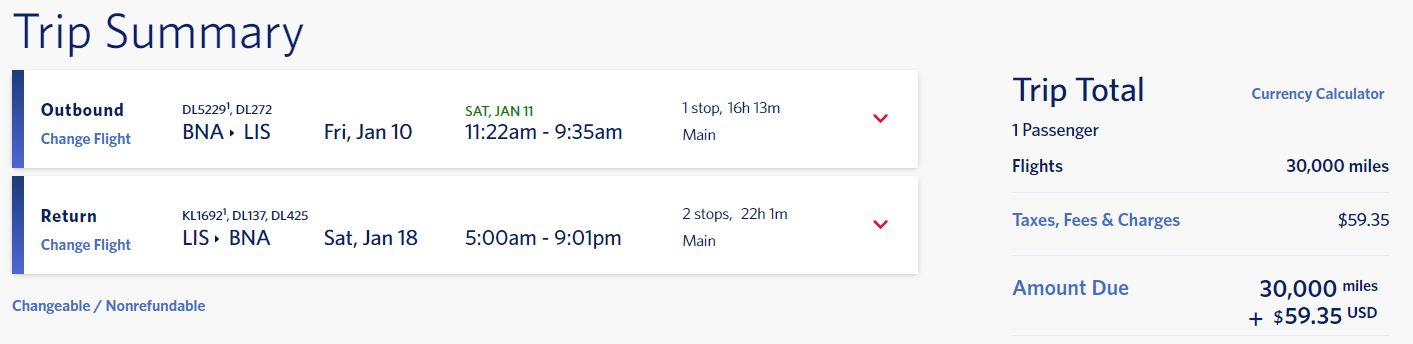 Nashville (BNA) to Lisbon (LIS) for 30,000 miles + $59 in taxes and fees round-trip in economy: