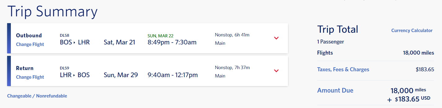 Boston (BOS) to London (LHR) for 18,000 miles + $184 in taxes and fees round-trip nonstop in economy: