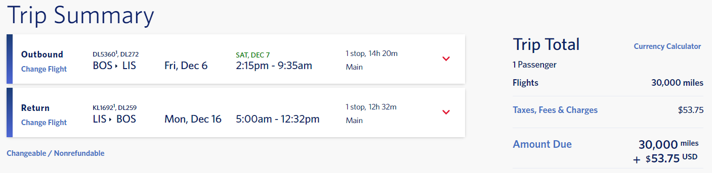 Boston (BOS) to Lisbon (LIS) for 30,000 miles + $54 in taxes and fees round-trip in economy: