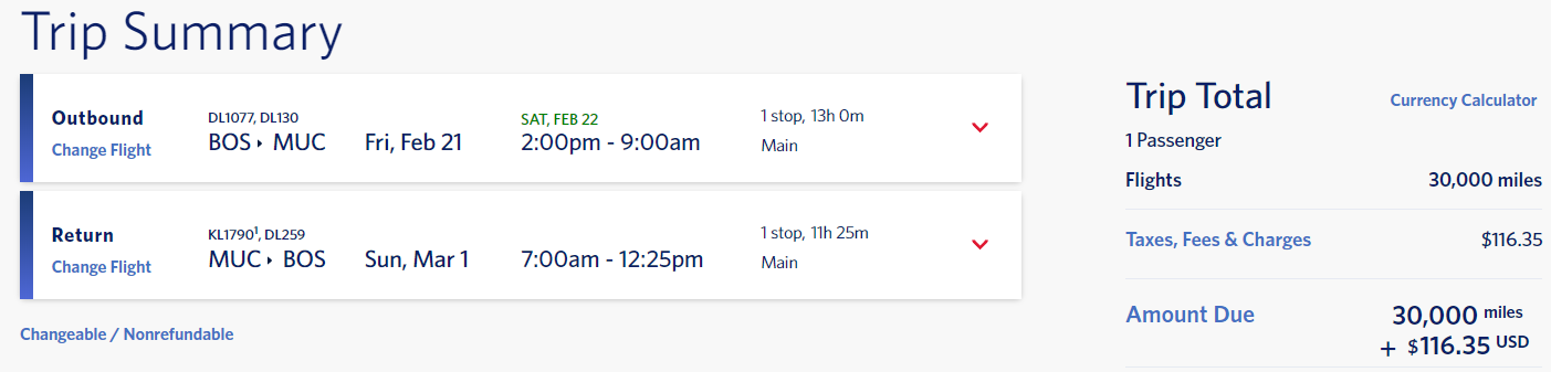 Boston (BOS) to Munich (MUC) for 30,000 miles + $116 in taxes and fees round-trip in economy: