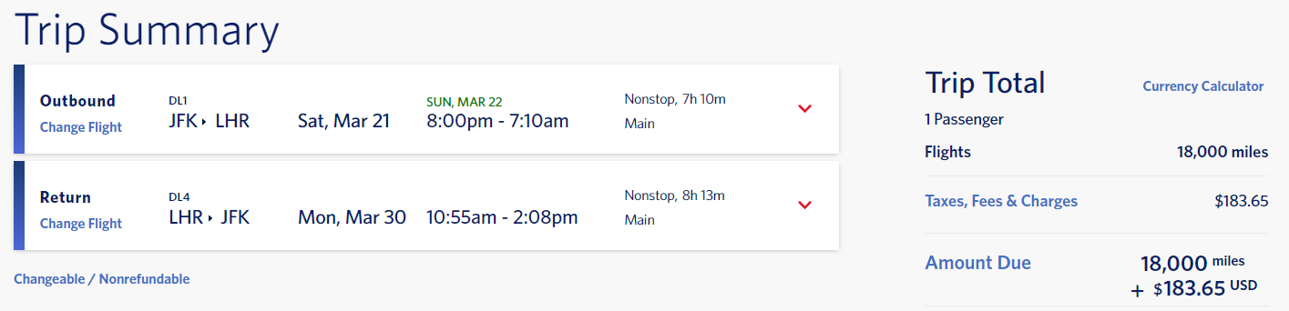 New York Kennedy (JFK) to London (LHR) for 18,000 miles + $184 in taxes and fees round-trip nonstop in economy: