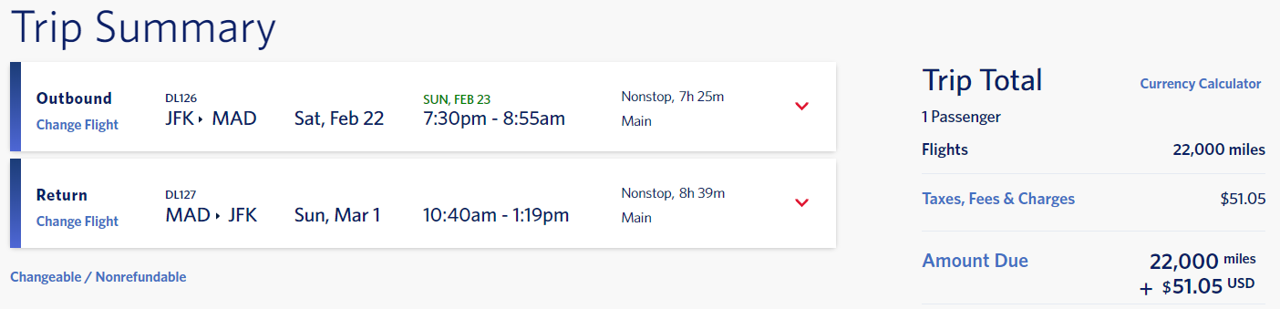New York Kennedy (JFK) to Madrid (MAD) for 22,000 miles + $51 in taxes and fees round-trip nonstop in economy: