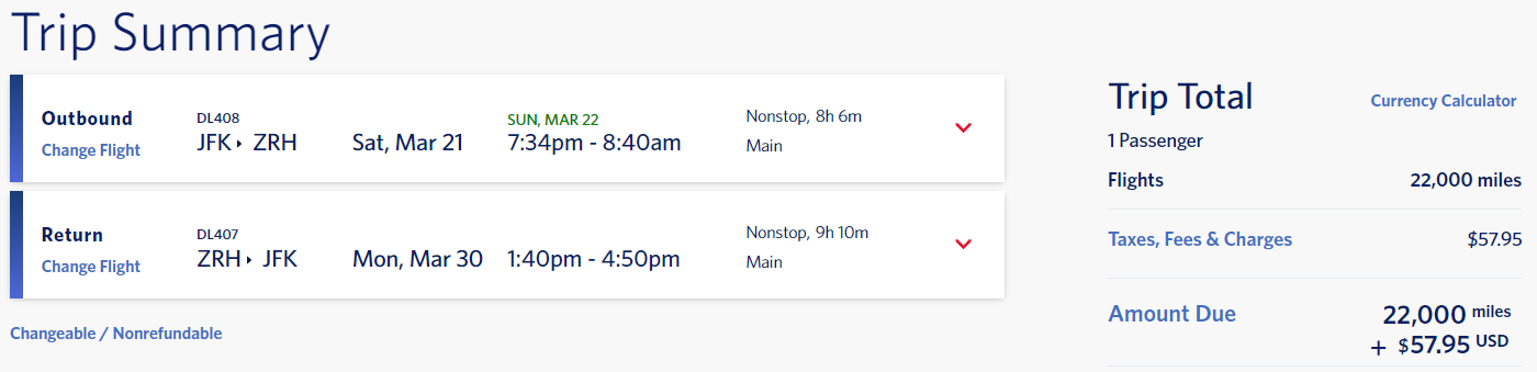 New York Kennedy (JFK) to Zurich (ZRH) for 22,000 miles + $58 in taxes and fees round-trip nonstop in economy: