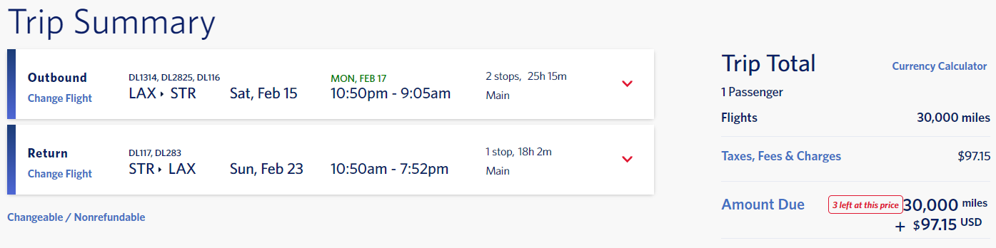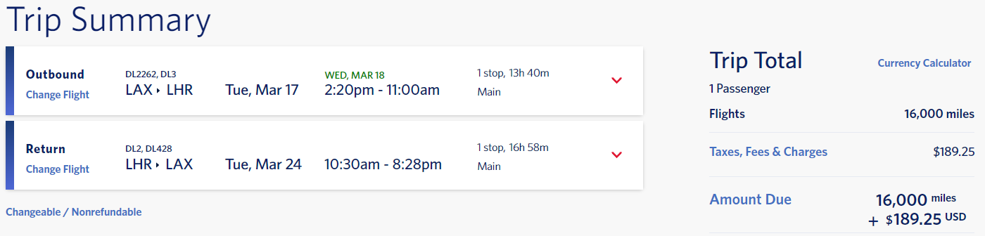 Cost: 16,000+ SkyMiles round-trip in Main Cabin (economy) plus taxes and fees