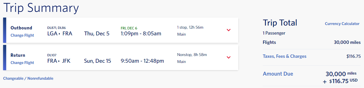 New York LaGuardia (LGA) to Frankfurt (FRA) -- returning to New York Kennedy (JFK) -- for 30,000 miles + $117 in taxes and fees round-trip in economy: