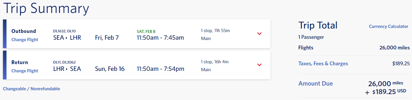 Seattle (SEA) to London (LHR) for 26,000 miles + $189 in taxes and fees round-trip in economy: