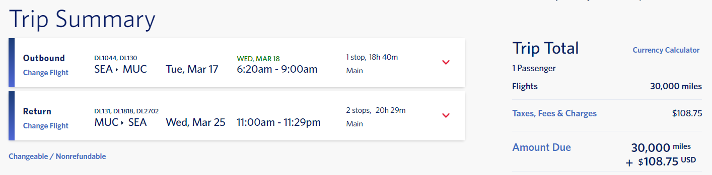 Seattle (SEA) to Munich, Germany (MUR) for 30,000 miles + $109 in taxes and fees round-trip in economy: