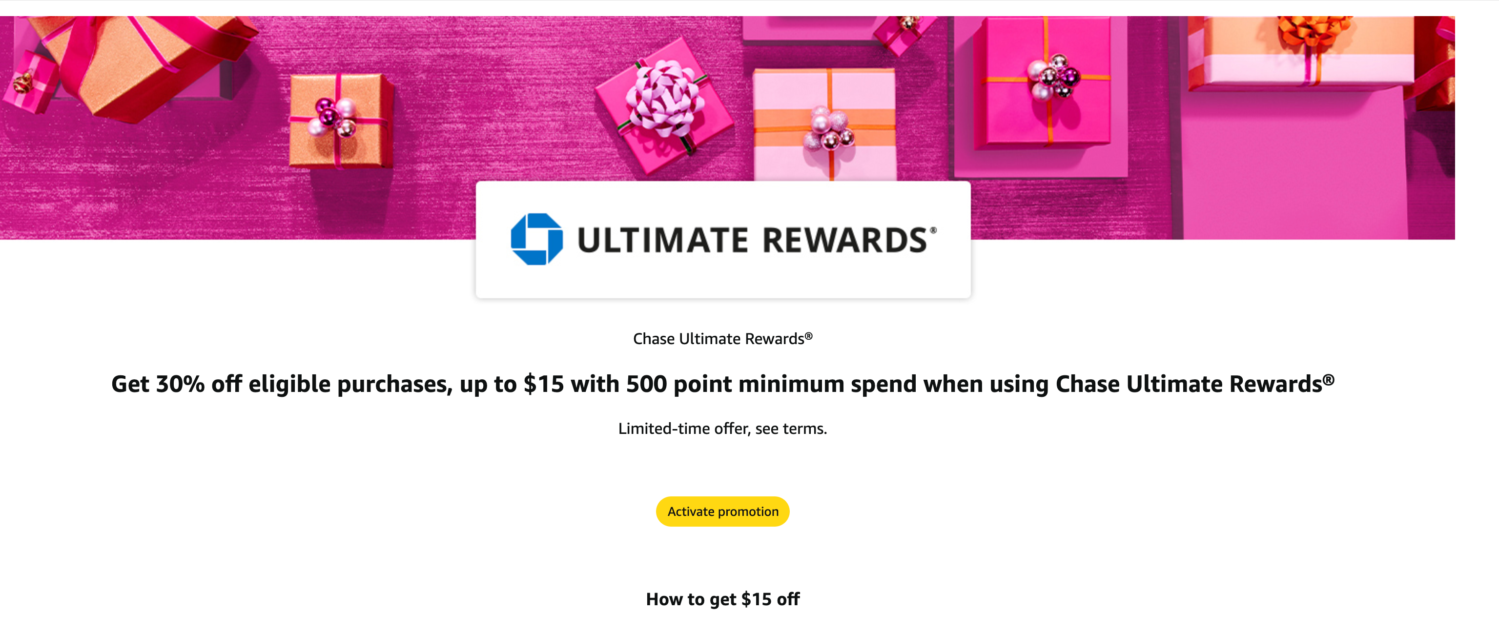 The version of this offer that I was most recently targeted for allowed me to save 30% on my Amazon order if I used at least 500 Chase Ultimate Rewards points, up to a max of $15 saved.