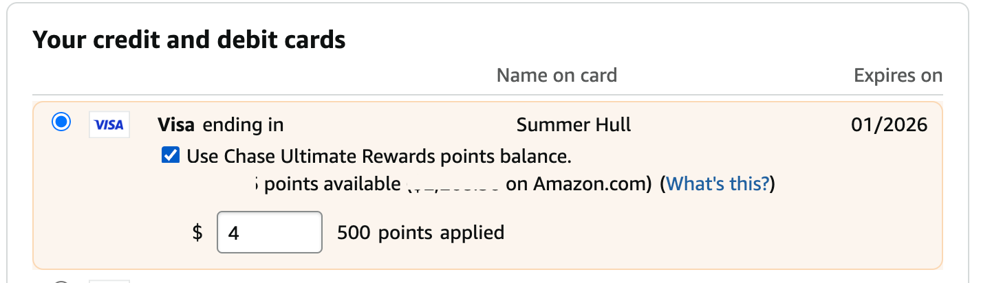 At the Amazon checkout screen, you'll be able to select the number of dollars you'd like to pay in Chase points toward your cart. For the purposes of this promo, $4 (aka 500 points) is often the minimum required amount.