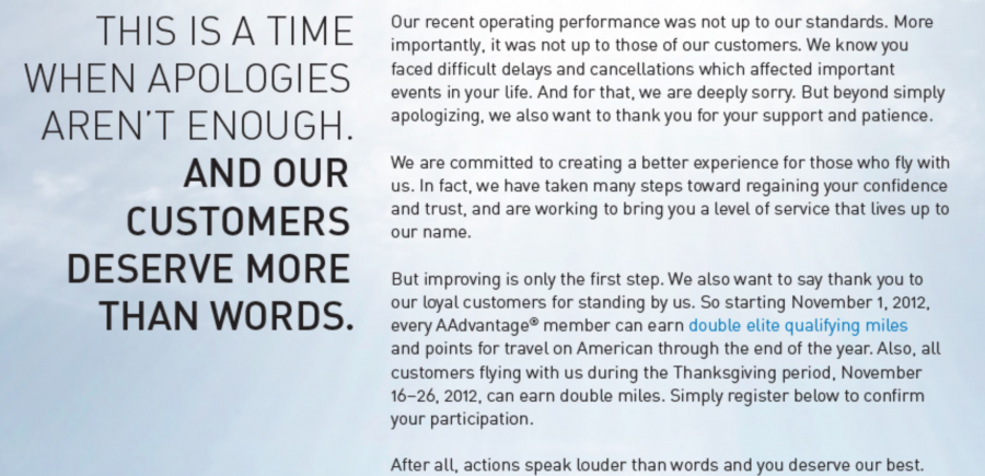 - Valid for all purchased tickets (read: not award tickets) on American Airlines, American Eagle and the American Connection® carrier marketed and operated flights from November 1, 2012, through December 31, 2012. Flights operated by our codeshare partners or oneworld alliance carriers are not eligible for this promotion.