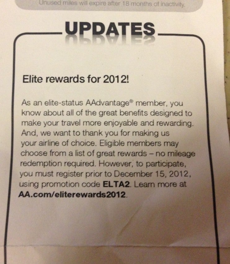 As you can see, there are choices like bonus award miles, upgrades, Admirals Club passes and membership and more. So let's say you're a Platinum who just hit your 50,000-point requirement. You'd just need to fly 12,500 more miles on eligible fares to hit that 75,000-point threshold for the elite rewards, and you could then choose an additional 25,000 miles as your gift. In all, for flying 12,500 miles you'd end up with 25,000 EQM's with this promo, and 62,500 redeemable miles - 12,500 base miles, 12,500 from the double miles promo and 12,500 from your 100% elite miles bonus, then the additional 25,000 from elite rewards. Not bad. Just remember, that if you do qualify for these elite rewards, you must register by December 15, 2012, using the code ELTA2 (see the letter I received about it below).