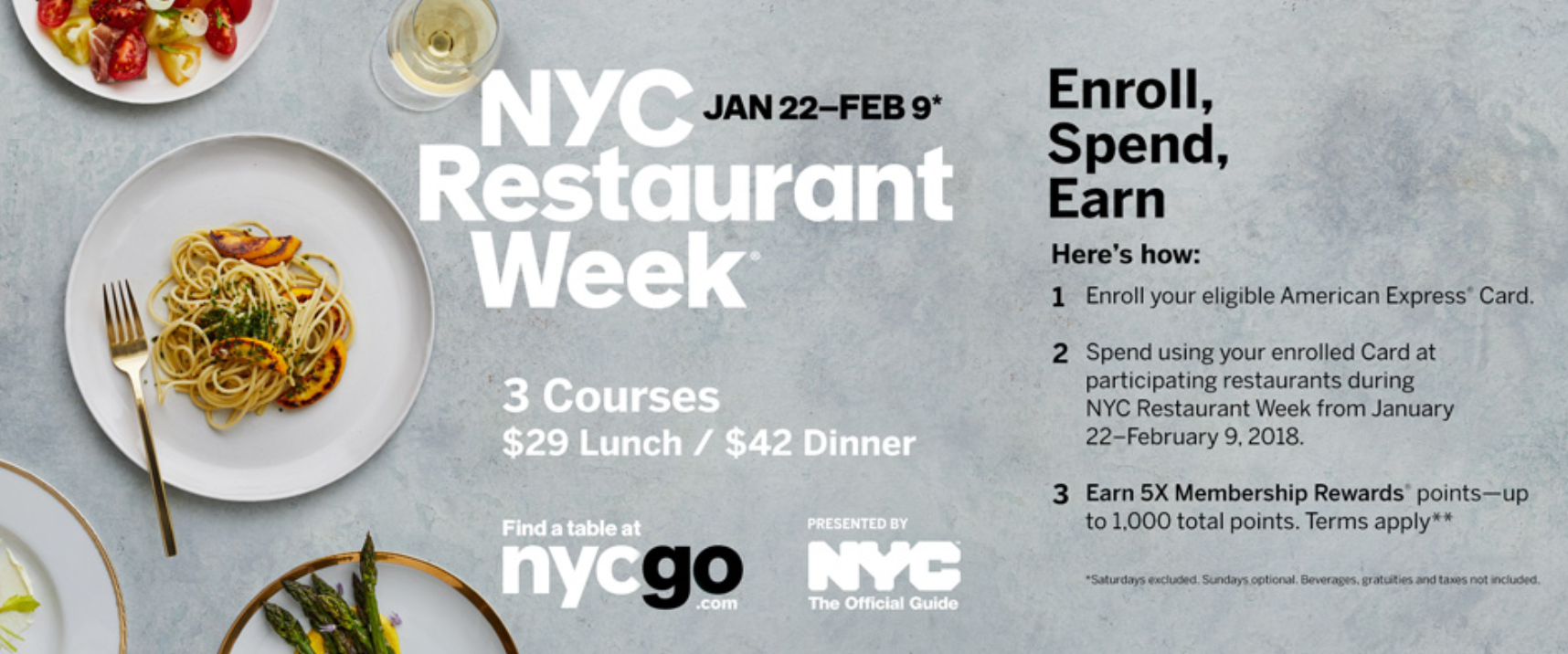 American Express is making it easy to earn bonus points while dining out during New York City Restaurant Week. For the NYC's 2018 Restaurant Week, which runs from January 22 to February 9, you can register your Membership Rewards-earning Amex card to earn 5x points on your restaurant purchases.