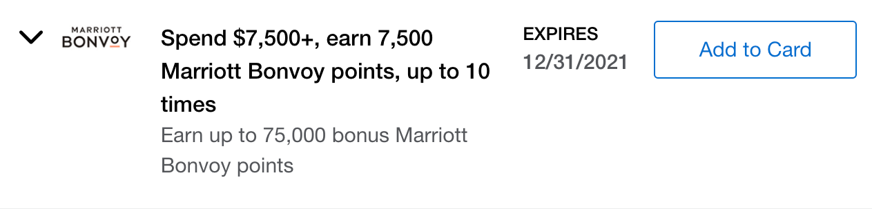 Card spend offer, up to 75,000 Bonvoy bonus points: You can earn 7,500 additional Marriott Bonvoy points -- worth $60 according to TPG valuations -- after spending $7,500 on purchases (up to 10 times) through Dec. 31, 2021. Note that eligibility for this offer includes the Marriott Bonvoy Brilliant, Marriott Bonvoy Business, and select Marriott Bonvoy cardmembers.