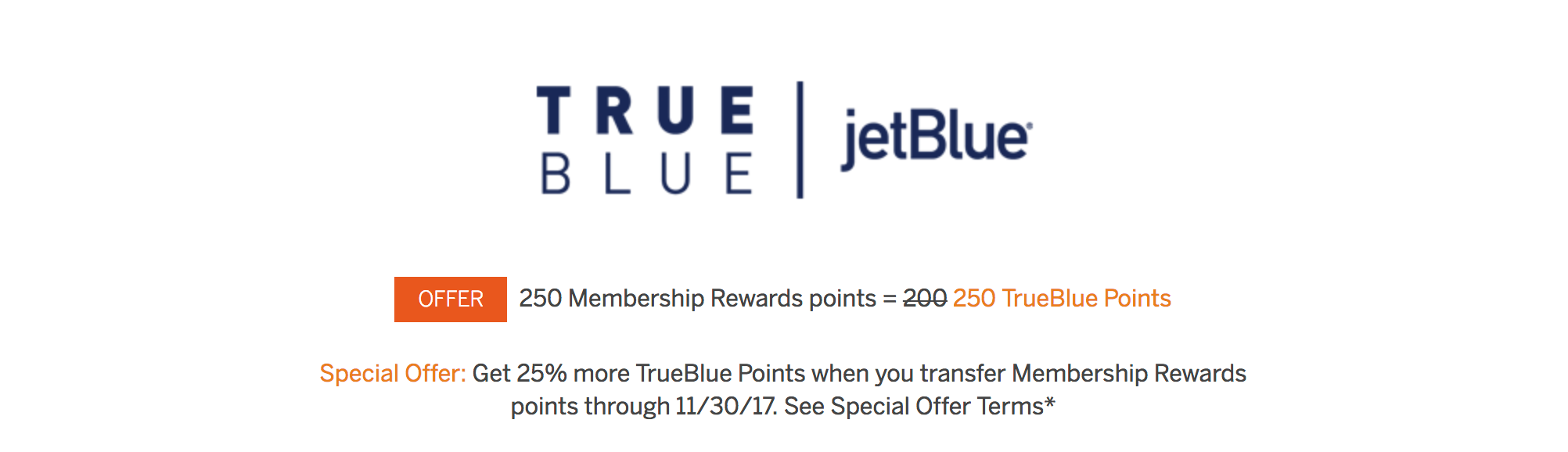For a limited time only, American Express is offering a 25% bonus when you transfer Membership Rewards to JetBlue's TrueBlue program. Through November 30, 2017, you can transfer your Membership Rewards points to JetBlue at a rate of 250:250 — or 1:1.