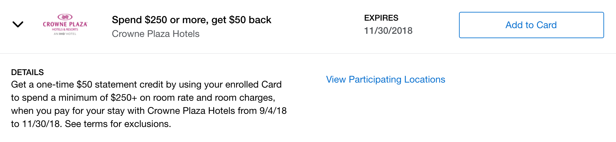 The other Amex Offer is for IHG loyalists, offering either 5,000 Membership Rewards points or $50 back on a Crowne Plaza stay of $250 or more: