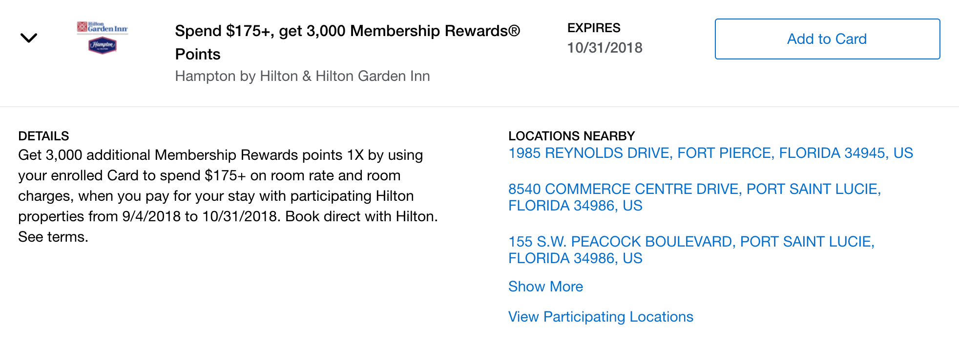 The first is valid at Hampton Inn or Hilton Garden Inn locations and, depending on the card you have, offers either 3,000 Membership Rewards points or $30 back on a stay of $175 or more: