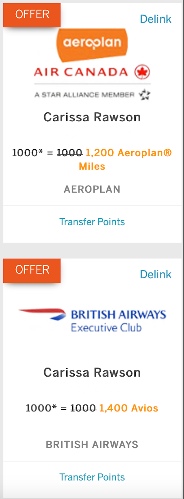 Normally you can transfer Amex points to Aeroplan at a 1000:1000, or 1:1 ratio, but with this deal, you'll earn either 1,100 or 1,200 Aeroplan miles for every 1,000 Amex points you move. Note that this offer is targeted, so it may not appear in your account. TPG Points & Miles Reporter Carissa Rawson received the offer for 20% (along with the previously existing 40% British Airways Avios transfer bonus), but others may only be targeted for 10%.