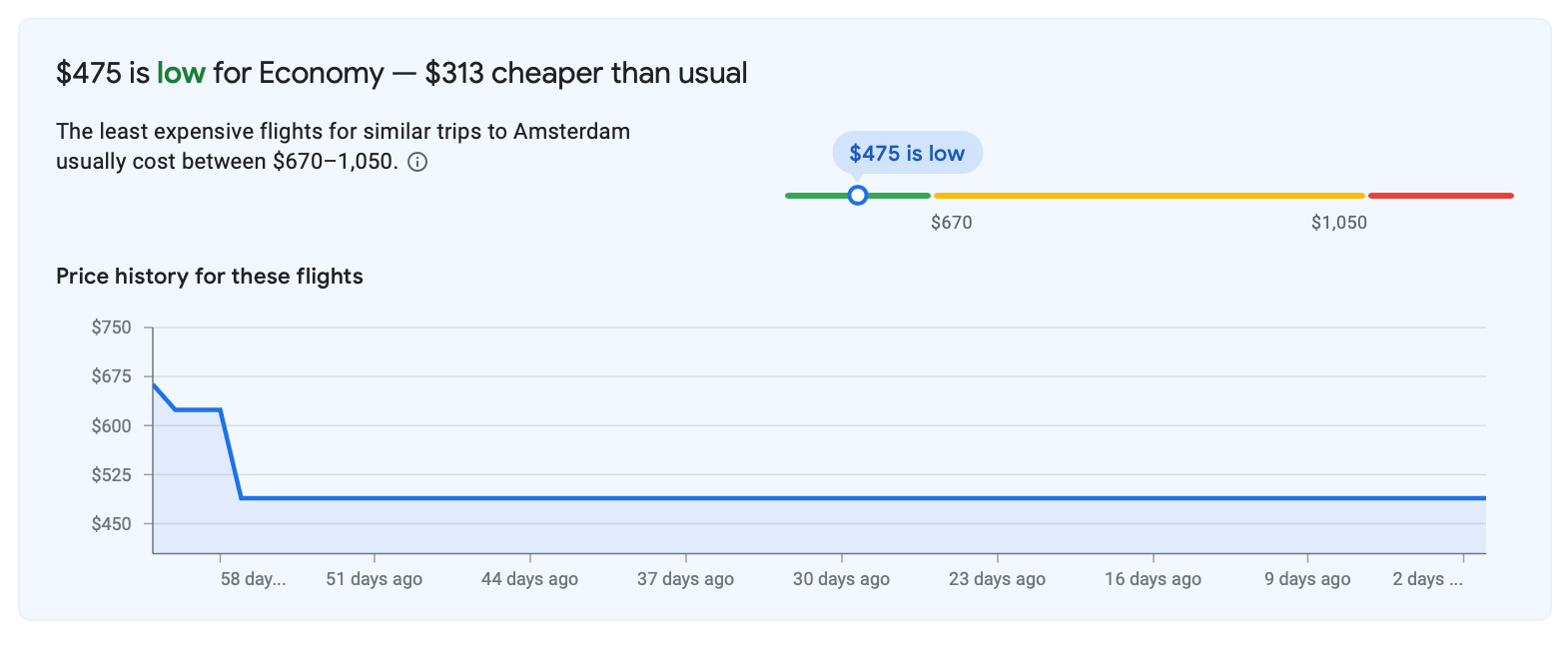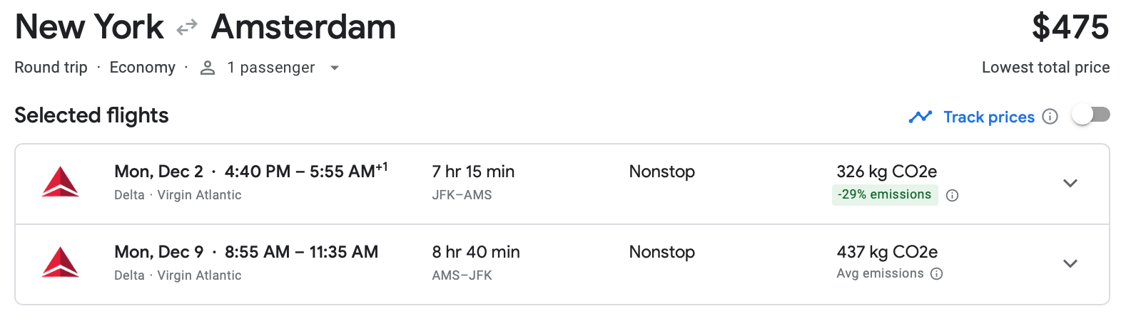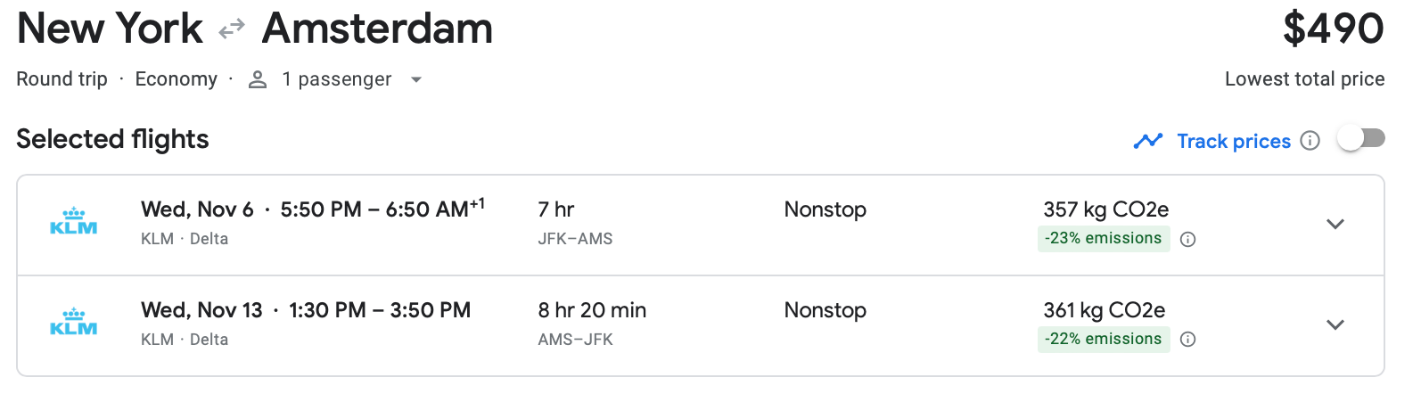 You can book this same itinerary in early December on Delta for as low as $475, which gives you the opportunity to enjoy Amsterdam's famous Christmas markets.