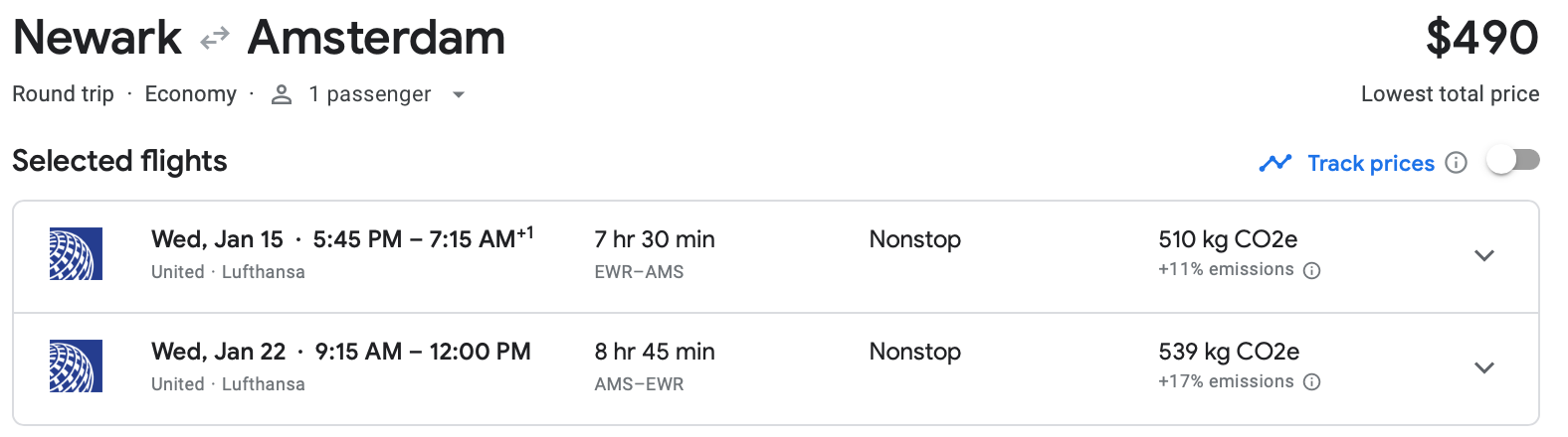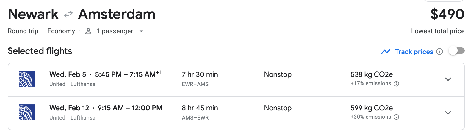 If you live in the tri-state area and prefer flying out of Newark, United has nonstop flights from Newark Liberty International Airport (EWR) to Amsterdam available for just $490. We found good availability at this price in January and February.