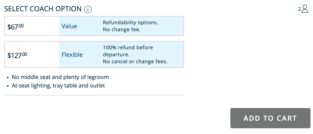 When selecting your train, be sure to choose the Value coach seat because that is the fare type on sale. You can get a refund for Value seat tickets if you cancel at least 15 days before departure; if you cancel within 14 days of departure, you'll have to pay a 25% fee. Alternatively, you can change travel for free. For more information on Value seats, see here.