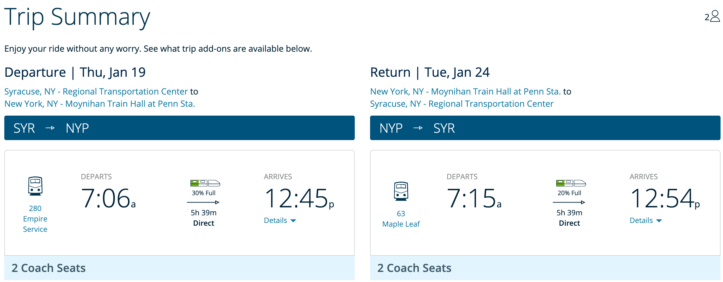 For the sake of this story, I searched a route on the Empire Service train. Specifically, I chose a round-trip journey from Syracuse to New York City's Penn Station for next week.
