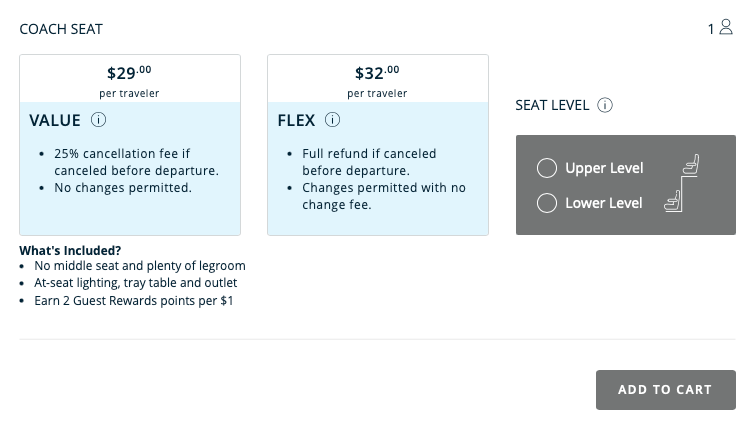 Travelers can choose from Value or Flex fares. Value fares are nonrefundable, are nonchargeable and incur a 25% fee if canceled before departure. Flex fares are slightly more expensive but are fully refundable and can be changed without a fee.