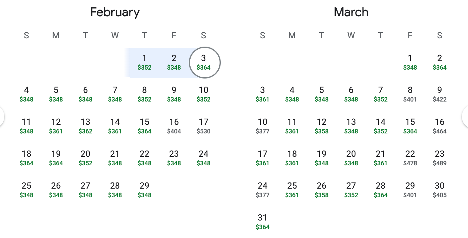 Flight options are for travel starting in February, and at the time of writing, there was similar availability all the way until November.