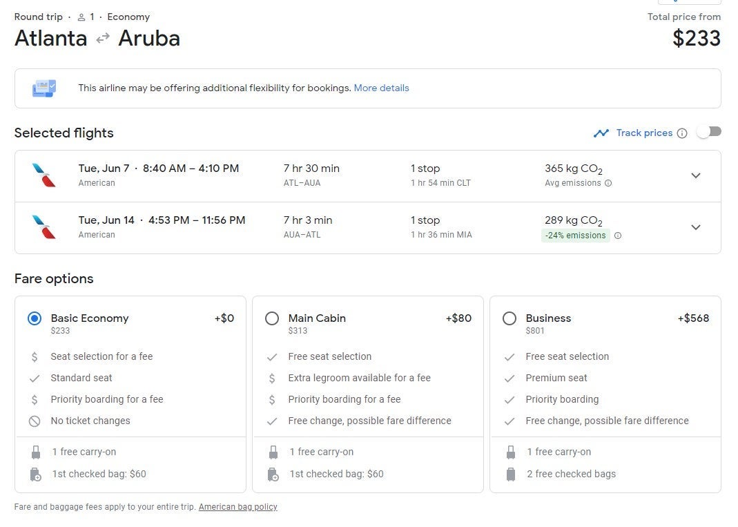 Flights from Atlanta (ATL) to Aruba (AUA) cost $233 round-trip. The flight below is for travel in June and includes a stop in Charlotte (CLT) on the departure and a stop in Miami (MIA) on the return.