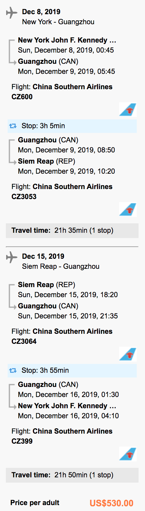 New York-JFK to Siem Reap (REP) for $530 round-trip on China Southern via GotoGate: