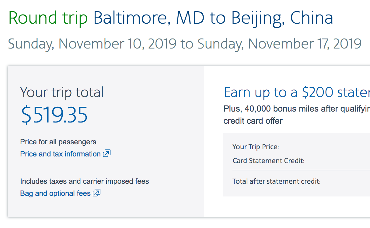 Baltimore (BWI) to Beijing (PEK) for $519 round-trip on American: