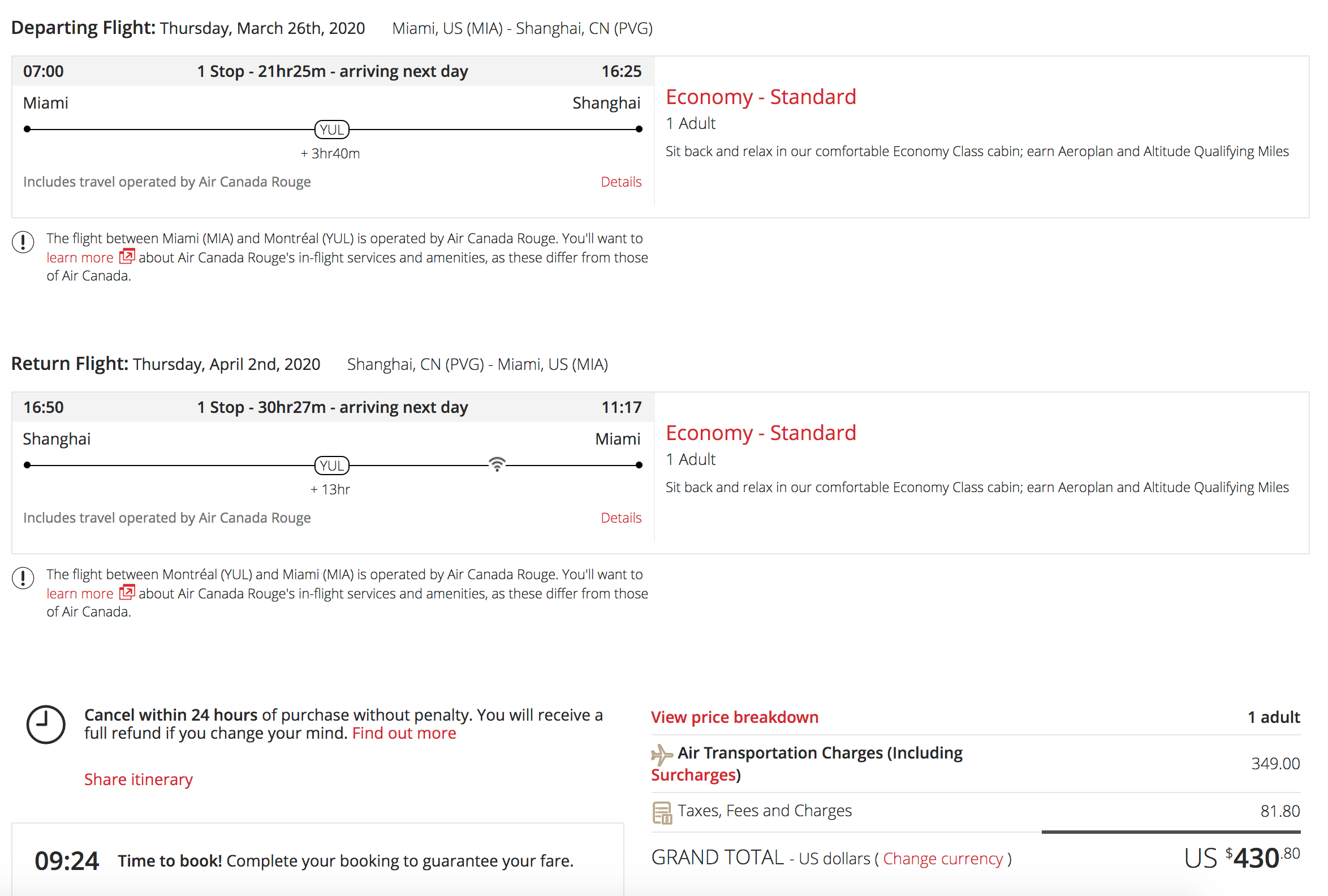 Miami (MIA) to Shanghai (PVG) for $431 round-trip on Air Canada:
