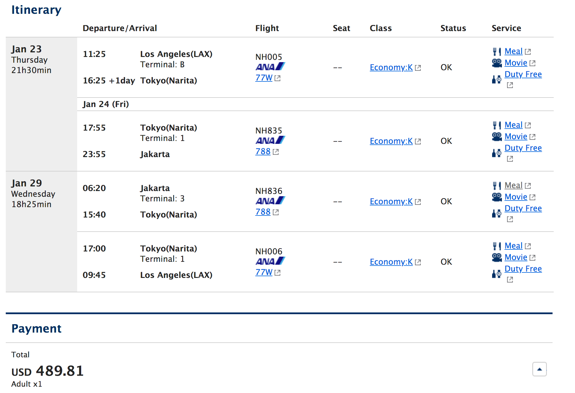 Los Angeles (LAX) to Jakarta (CGK) for $490 round-trip on ANA: