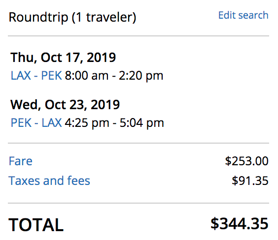 Los Angeles (LAX) to Beijing (PEK) for $344 round-trip on United:
