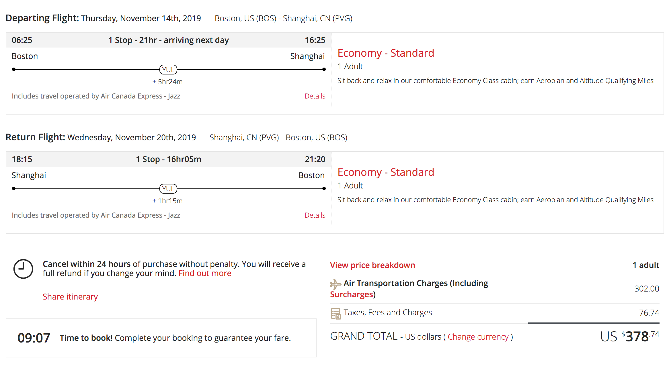 Boston (BOS) to Shanghai (PVG) for $379 round-trip on Air Canada: