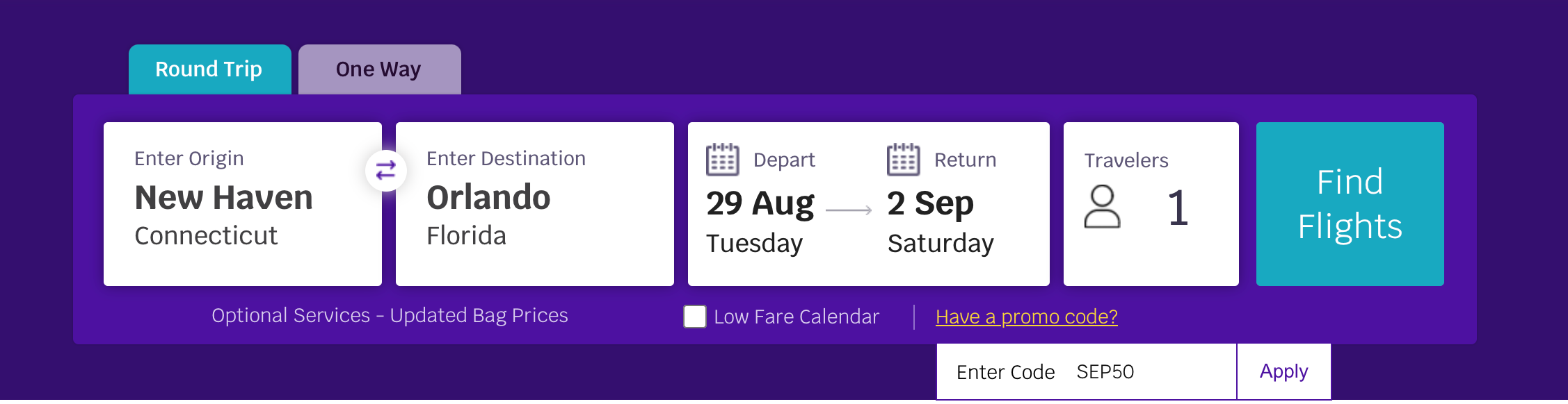 Avelo asks you to enter the promo code when looking up the fares for a particular route. Beneath the search bar, you'll find the space to enter the promo code.