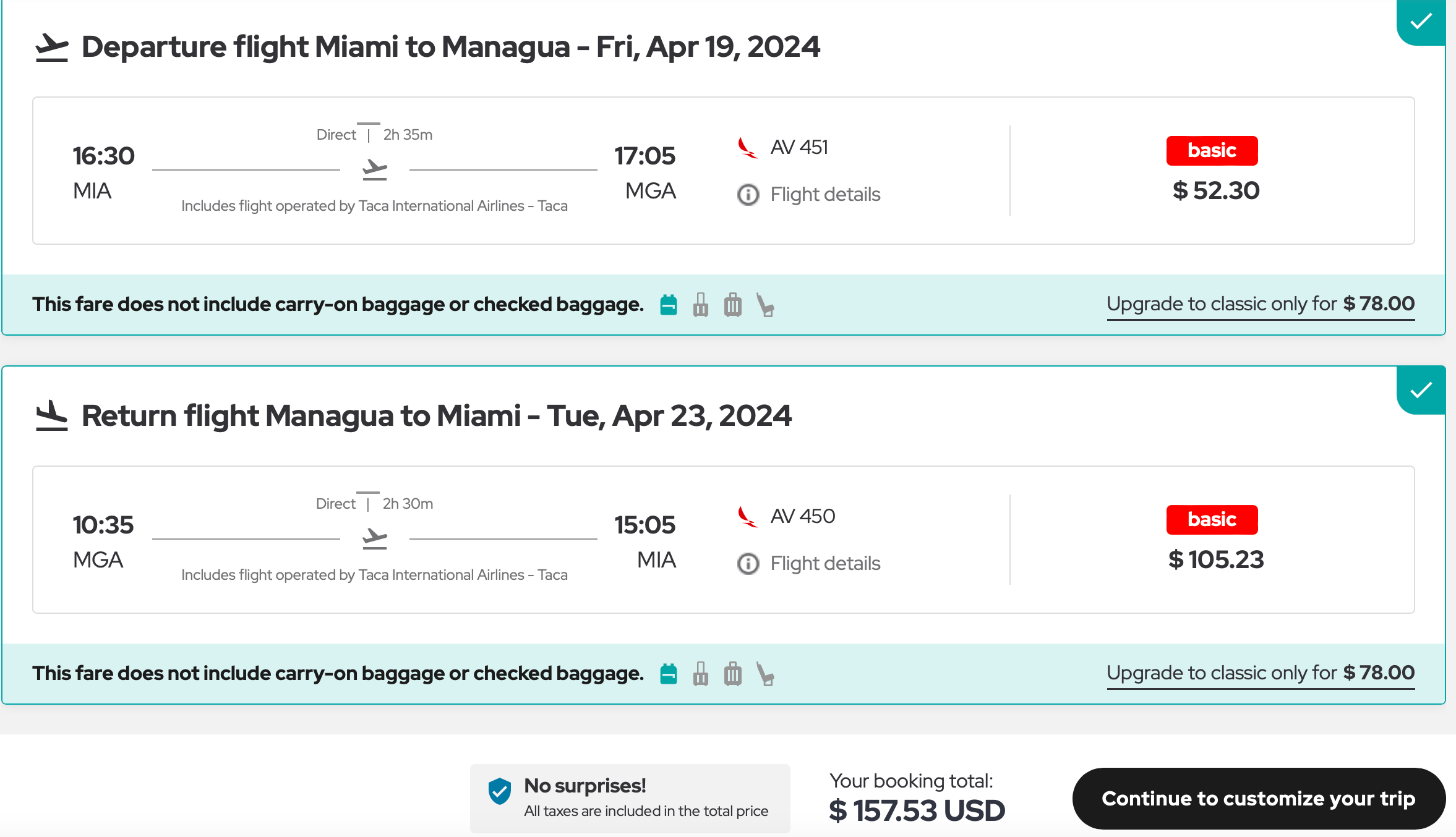 To take advantage of the red sale, you must book your flights by April 14. The travel window is from now until March 27, 2025. This sale is for Avianca's basic economy tier. You get a free personal item, but a carry-on bag will cost you around $55 each way. A better deal is to check your bag, which will cost you roughly $45 each way.