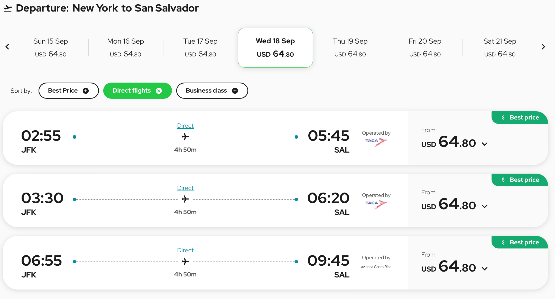 There is good availability on flights from New York City to San Salvador, too. We found several departure flights from JFK in September for as little as $64.