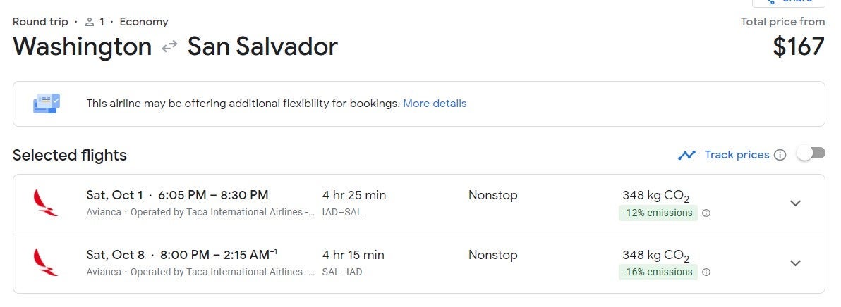 You can travel to San Salvador (SAL), the capital of El Salvador, from Washington, D.C., (IAD) for $167 round trip. According to Google Flights, this price is over $200 cheaper than usual for travel in October.