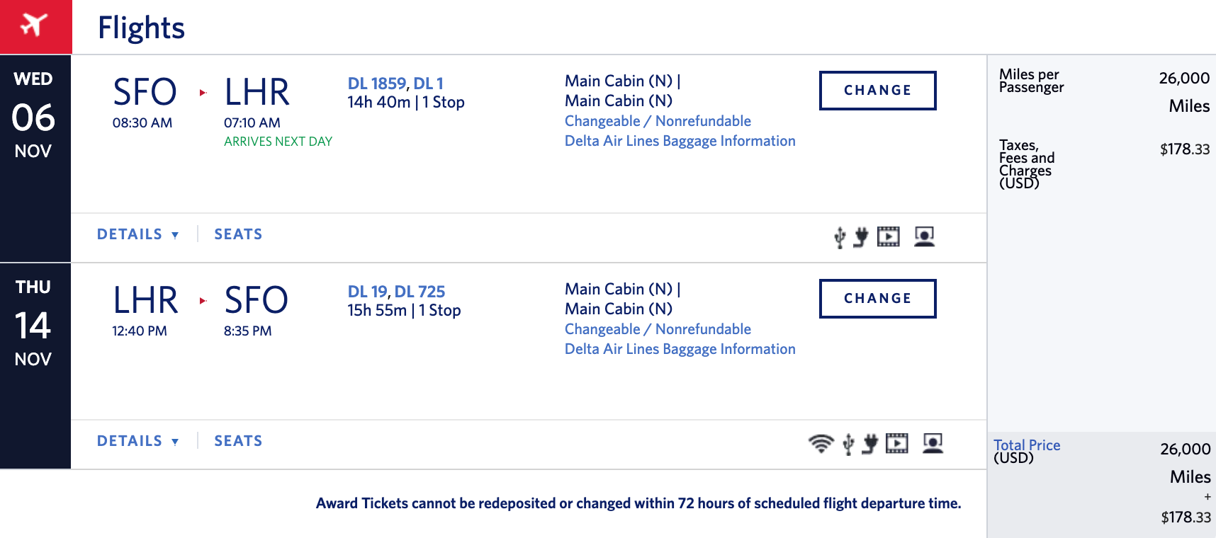 Although Delta is experimenting with basic-economy awards, all of these examples book into the Main Cabin fare class. So you’ll be able to check up to a 50 pound bag each way and select your seat for free for the flight.