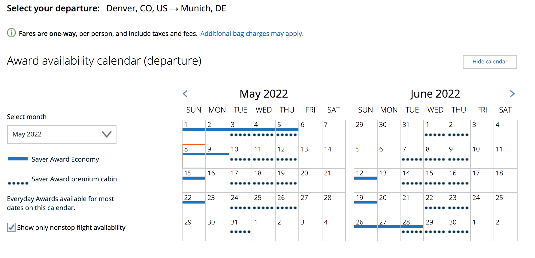If you want to beat the summer rush, you can fly from Denver to Munich as early as April 23, 2022. On many of these days, as many as five business-class award seats are available. This route will be operated by a Boeing 787-9.