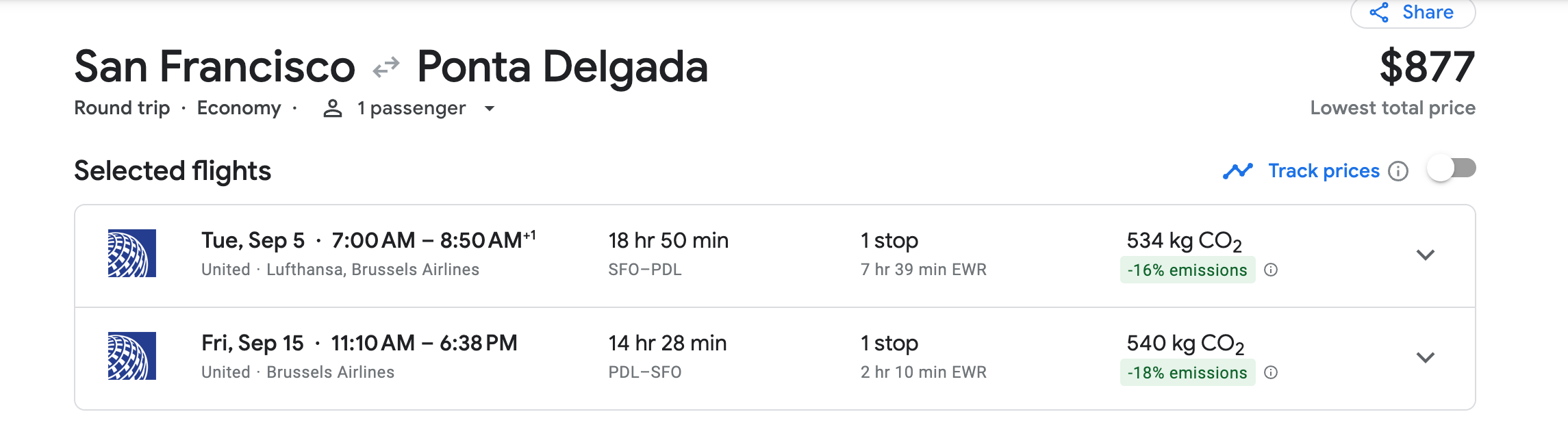 This round-trip journey from San Francisco for Sept. 5-15 offers great premium economy availability. You would depart Tuesday morning and, after a long layover at Newark, land in the Azores Wednesday morning.