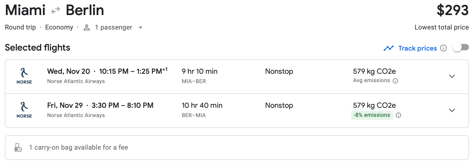 You can also fly nonstop from Miami International Airport (MIA) to Berlin in the fall for less than $300 round-trip on Norse Atlantic. You'll notice this itinerary includes Thanksgiving. That means you can peruse Berlin's famous Christmas markets, which usually begin the last week in November.