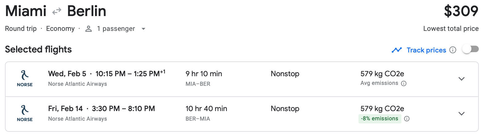 Flights from Miami to Berlin in early 2025 are slightly more expensive, but $309 for a nonstop ticket is still a really good price for this route.
