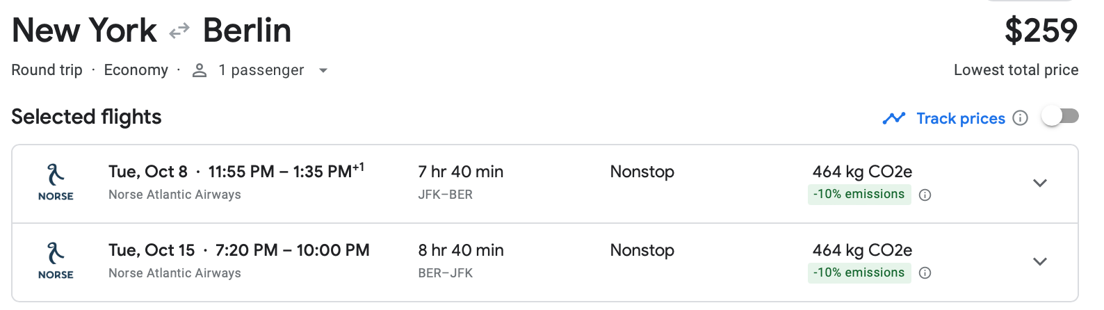 Norse Atlantic has nonstop flights from New York's John F. Kennedy International Airport (JFK) to Berlin Brandenburg Airport (BER) in early October for just $259 round-trip. That's about half of what this route typically sells for. Don't wait long to book this.