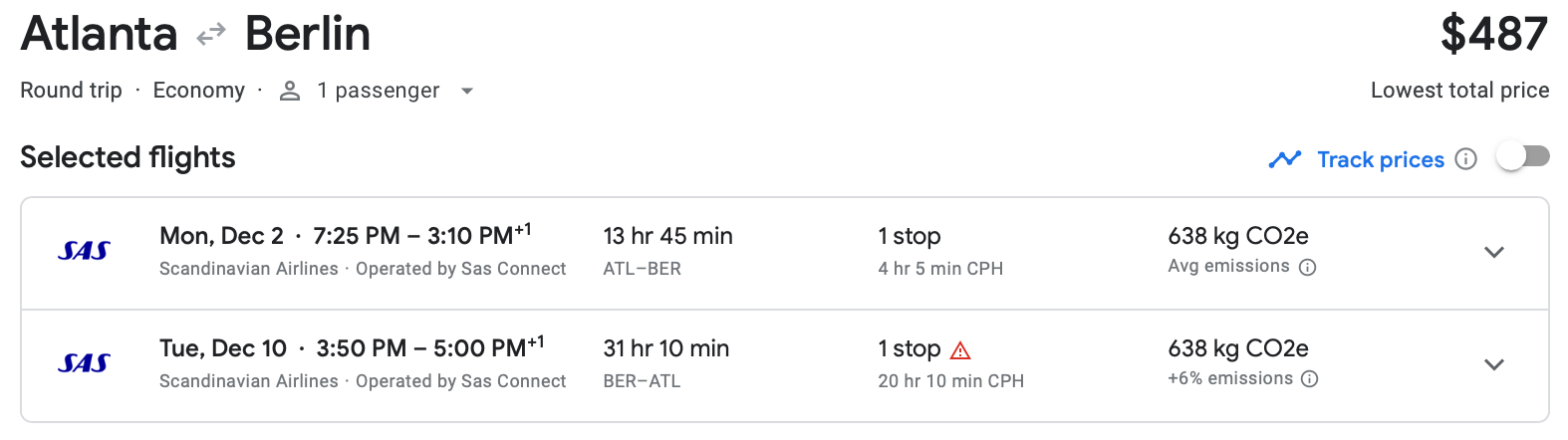 There are some solid sale fares out of Atlanta to Germany, as well. SAS has round-trip fares from Hartsfield-Jackson Atlanta International Airport (ATL) to Berlin in early December for $487. That includes layovers in Copenhagen, with a 20-hour stop in the Danish capital on the return flight.